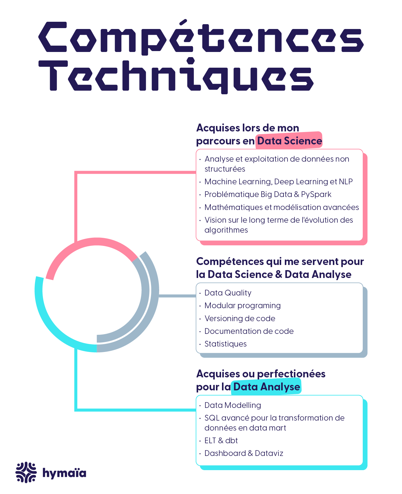 Voici un aperçu non exhaustif sur les compétences que j’ai apprises lors de mon parcours en data science qui m’ont été utiles pour la data analyse, celles que je n’utilise plus ou moins et enfin celles que j’ai du apprendre ou perfectionner.